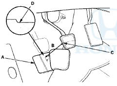 3. Pull back the carpet, and find the cutout (A) in the insulation. Measure the pedal height (B) from left side middle of the brake pedal pad (C) to the floor (D) without the insulation as shown.