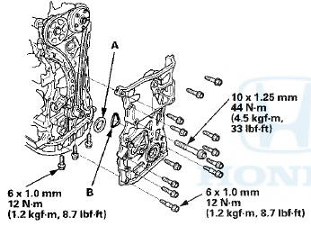 14. Remove the old liquid gasket from the chain case mating surfaces, the bolts, and the bolt holes.