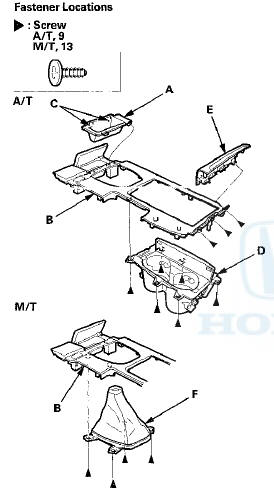 4. M/T: Remove the screws, then remove the shift lever boot (F).
