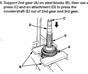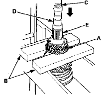5. Support 4th gear (A) on steel blocks (B), then use a press (C) and an attachment (D) to press the countershaft (E) out of 4th gear and 5th gear.