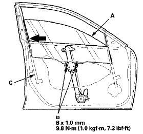4. Push the glass against the glass run channel (C), then tighten the glass mounting bolts.