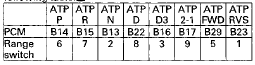 11. Check for continuity between the transmission range switch circuit terminal and the PCM terminal of the input which indicated OFF, refer to the following table.