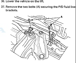 34. Remove the bolt (A) securing the P/S fluid line bracket and unclamp the P/S fluid line clamp (B) on the front subframe.