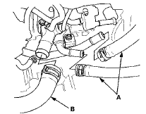 40. Disconnect the heater hoses (A) and the upper radiator hose (B).