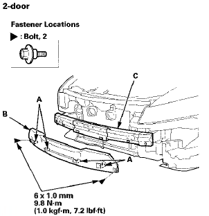 7. If necessary, remove the bolts, and release the hooks (A), then remove the front bumper absorber (B) from the front bumper beam (C).