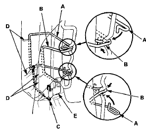 - Reinstall airbag attachment wires A and B, and the bracket (E) of attachment wire C, securely to the seat-back frame as shown.