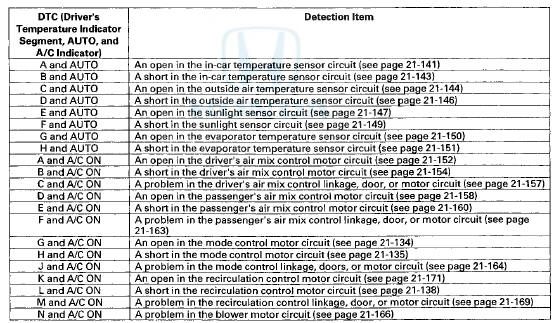 • If there is a problem with the system, the temperature indicator flashes 88, and the A/C ON indicator or the AUTO indicator (or both) also flashes. Segments in the temperature indicator then indicate which DTCs are present.