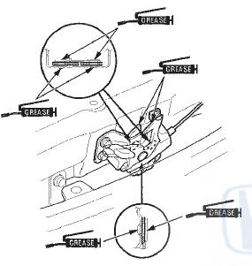 8. Apply multipurpose grease to the hood latch and the hood hinges as indicated by the arrows.