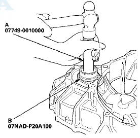 3. Install a new oil seal flush with the transmission housing using the 15 x 135L driver handle (A) and the oil seal driver attachment (B).