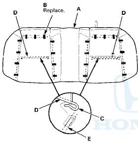 - Replace all of the upholstery rings (A) fastening the seat cushion cover (B) to the pad wires (C) with new ones using commercially available upholstery ring pliers (D).