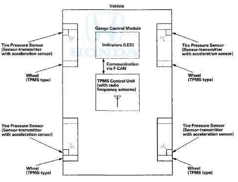 Each sensor is an integrated unit made up of the tire valve stem, a tire pressure sensor, and a transmitter. The unit is attached to the inside of the wheel, around the valve stem. The sensor transmits the internal tire information to the TPMS control unit once every 60 seconds when the vehicle speed exceeds 28 mph (45 km/h). When the TPMS control unit receives a tire pressure signal that is less than: 168 kPa (1.7 kgf/cm2,24 psi) with 16 inch wheels, 175 kPa (1.8 kgf/cm2, 25 psi) with 17 inch wheels, the TPMS control unit then turns on the low tire pressure indicator. When that tire's pressure is increased to more than: 190 kPa (1.9 kgf/cm2, 28 psi) with 16 inch wheels, 200 kPa (2.0 kgf/cm2,29 psi) with 17 inch wheels, and the vehicle is driven above 28 mph (45 km/h) the transmitter sends the tire pressure signal to the TPMS control unit, and then the TPMS control unit turns the indicator off.