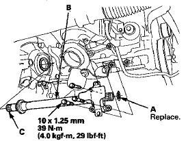 53. Install the rear engine mount upper bracket (A), the bolts (B), and a new bolt (C), and tighten the bolts.