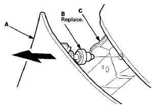 - To prevent the side curtain airbags from deploying improperly and possibly causing injury, inspect the trim and replace it with a new one if it has any of the following damage: - Any cracks or deformations in the B-pillar upper trim (B) or the upper hooks (C), or any stress-whitened areas in the upper part of the trim
