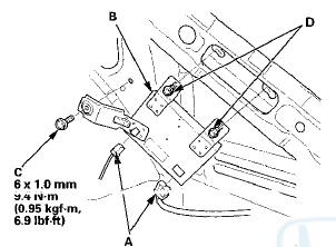 3. Remove the mounting bolt (C) and loosen the mounting bolts (D), then remove the XM receiver.